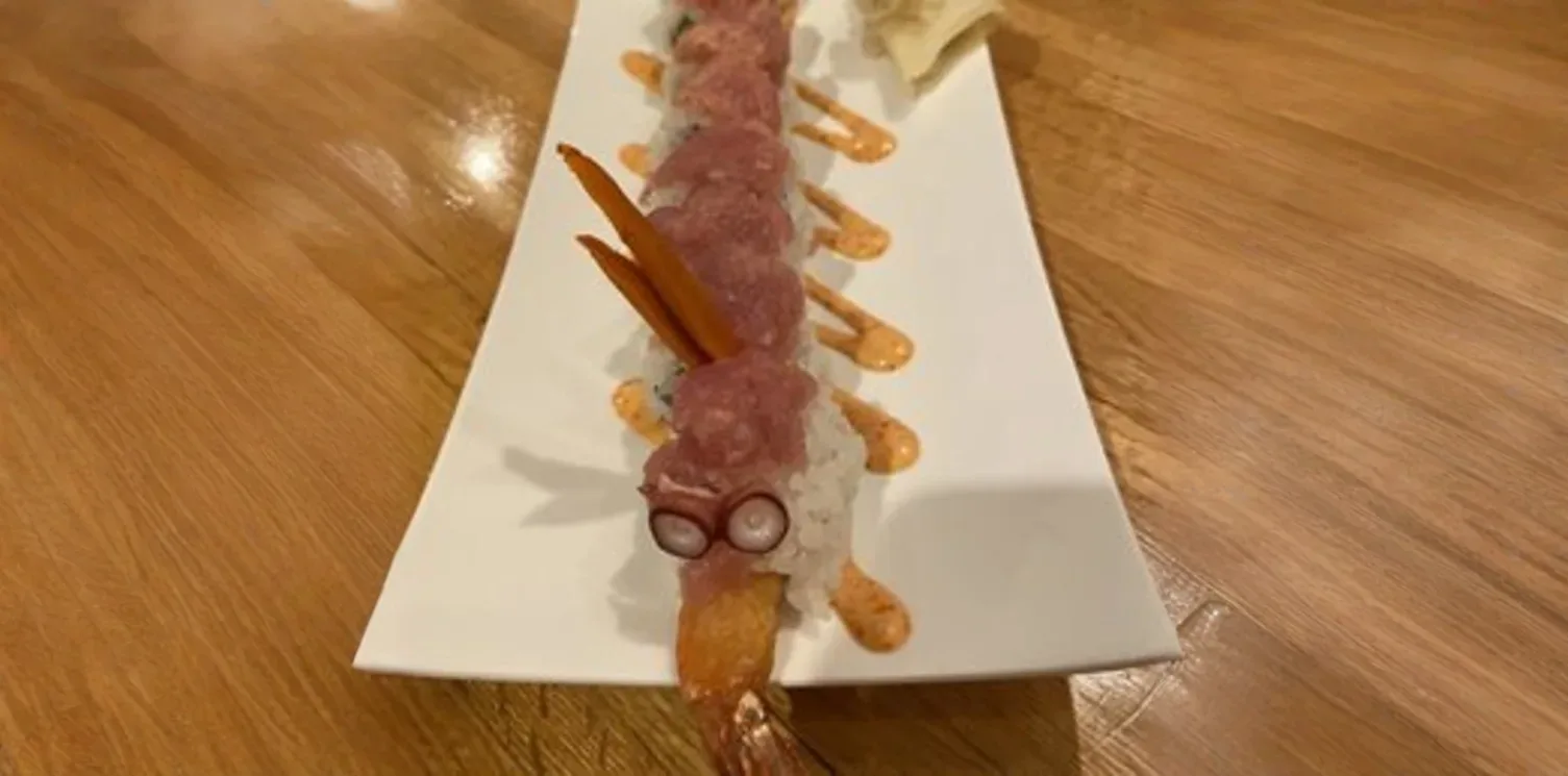 Experience the vibrant flavors of our signature Red Dragon Roll. This exquisite sushi creation typically features crispy shrimp tempura and fresh cucumber inside, elegantly crowned with slices of luscious tuna and creamy avocado. It is often drizzled with a delicate special sauce, offering a harmonious blend of textures and tastes that is both visually striking and incredibly satisfying.