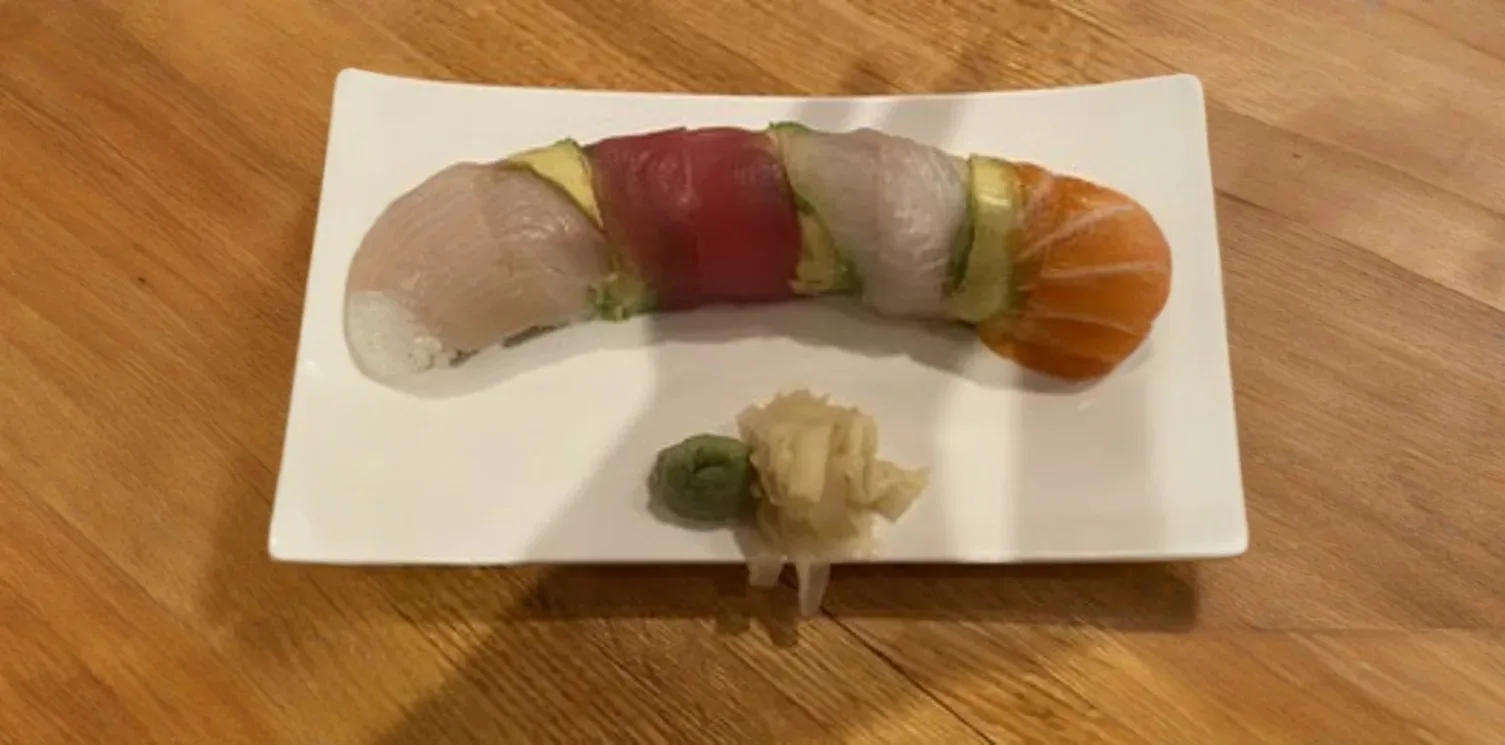 A vibrant and visually appealing sushi roll that typically starts with a California Roll base, then topped with an array of thinly sliced fresh fish such as tuna, salmon, yellowtail, and sometimes shrimp, along with avocado, creating a colorful 'rainbow' effect.