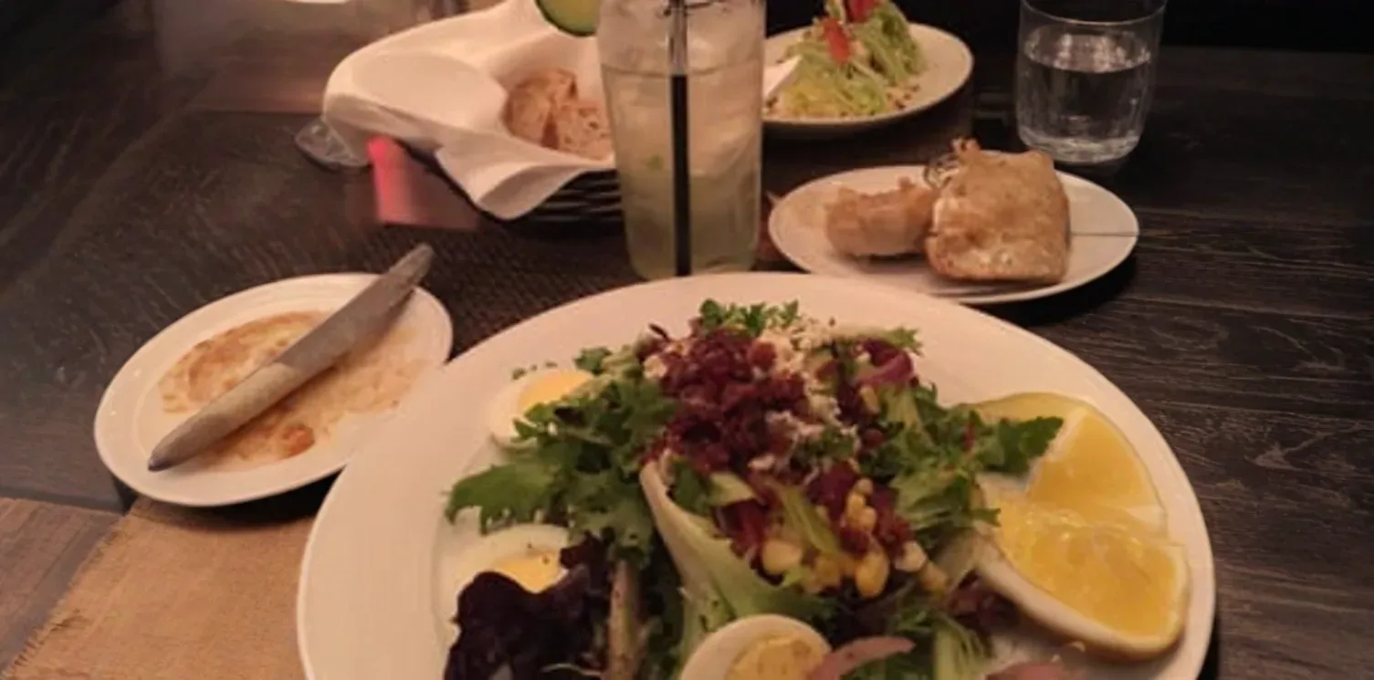 A classic American bistro staple, featuring a substantial wedge of crisp iceberg lettuce. Drizzled generously with a creamy, house-made blue cheese dressing, and adorned with crunchy bacon lardons, fresh cherry tomatoes, and thinly sliced red onion. A refreshing and flavorful start to any meal.
