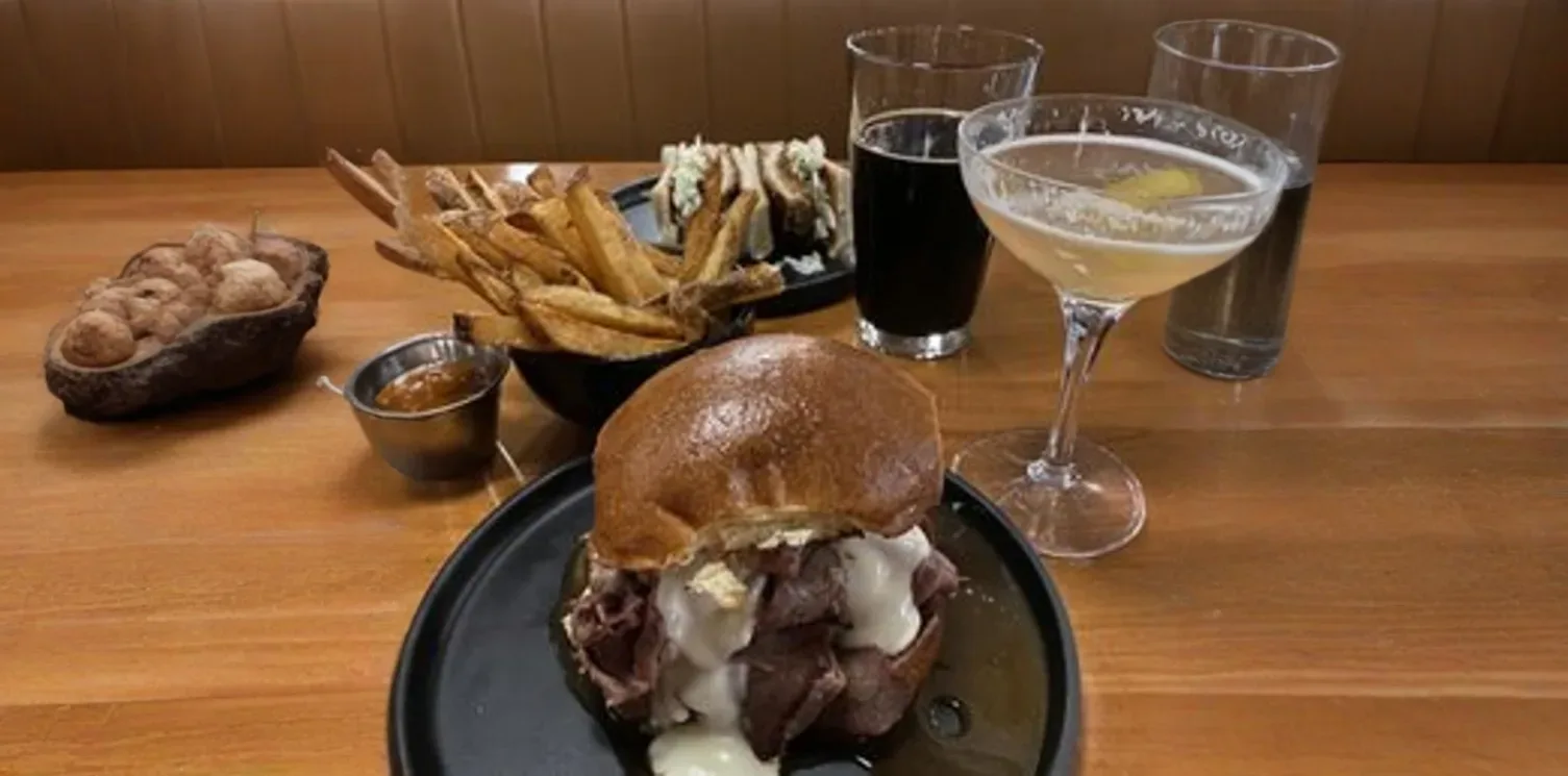 A robust sandwich featuring thinly sliced, slow-roasted prime beef, perfectly tender and flavorful. Piled high on a crusty baguette or artisanal roll, complemented by caramelized onions, a zesty horseradish cream, and melted provolone cheese. Served with a side of rich au jus for dipping.