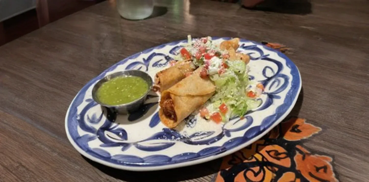 Four crispy, golden-fried rolled corn tortillas filled with your choice of seasoned shredded chicken or beef. Topped with crisp lettuce, fresh tomato, a drizzle of crema, and a dusting of cotija cheese. Served with a side of tangy salsa verde.
