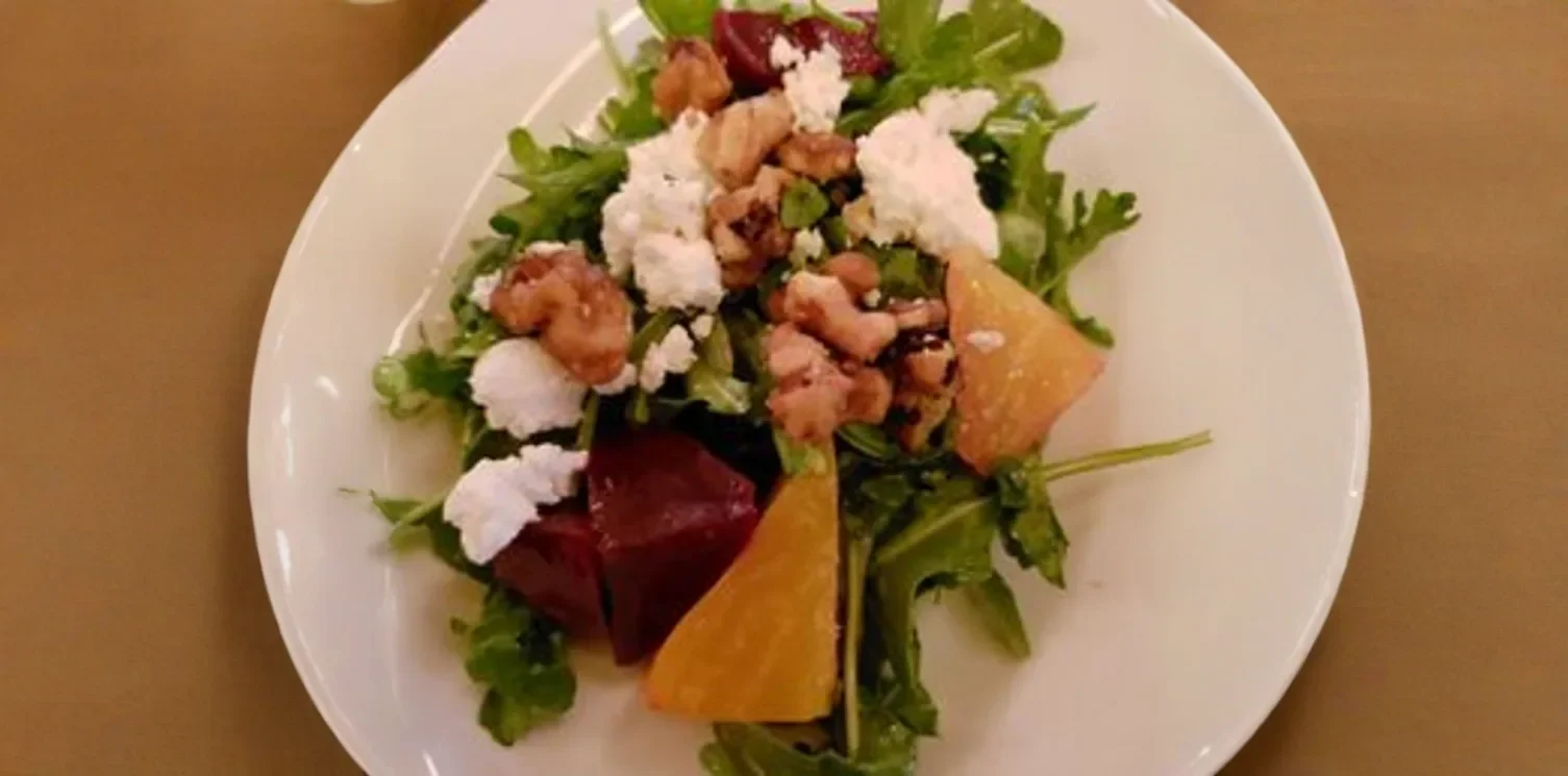 A vibrant and earthy salad showcasing roasted golden and red beets, artfully arranged over a bed of mixed greens, crumbled goat cheese, toasted walnuts, and drizzled with a light citrus vinaigrette.