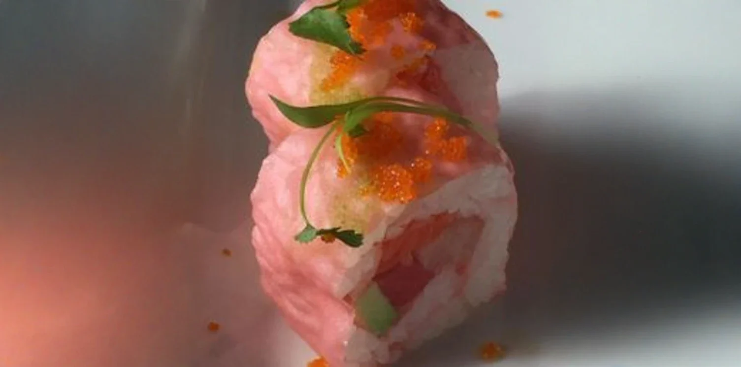 An elegantly presented and flavorful sushi roll, often distinguished by its vibrant pink hue, typically achieved with pink soy paper (mamenori). The roll usually contains a delicious combination of ingredients such as shrimp tempura, spicy tuna, creamy avocado, or crab, complemented by a delicate sweet or savory sauce, offering both visual appeal and a delightful taste.