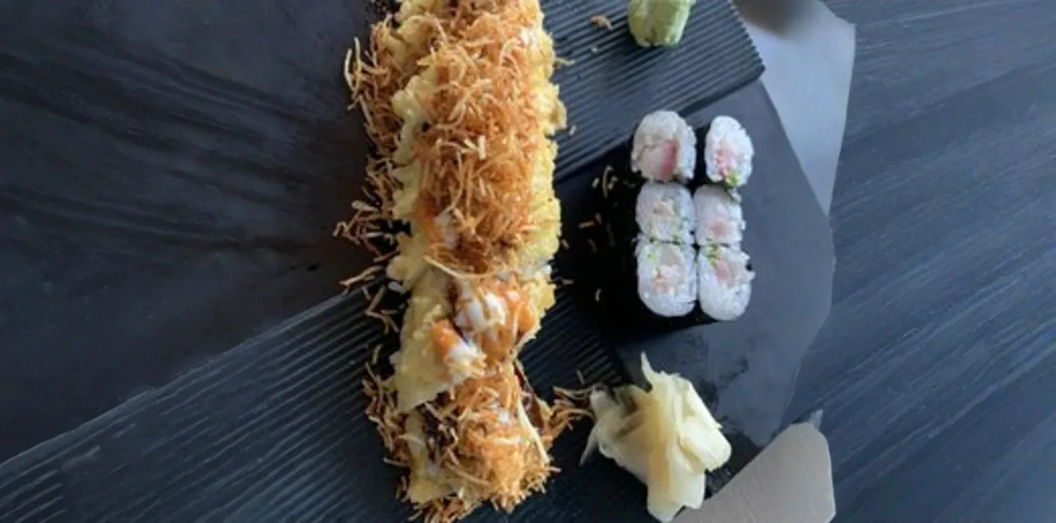 A hearty and generously sized sushi roll, featuring a robust combination of fresh seafood like shrimp tempura and crab stick, crisp vegetables, and often finished with a dynamic sauce or crunchy toppings. It's designed for a substantial and satisfying sushi experience.