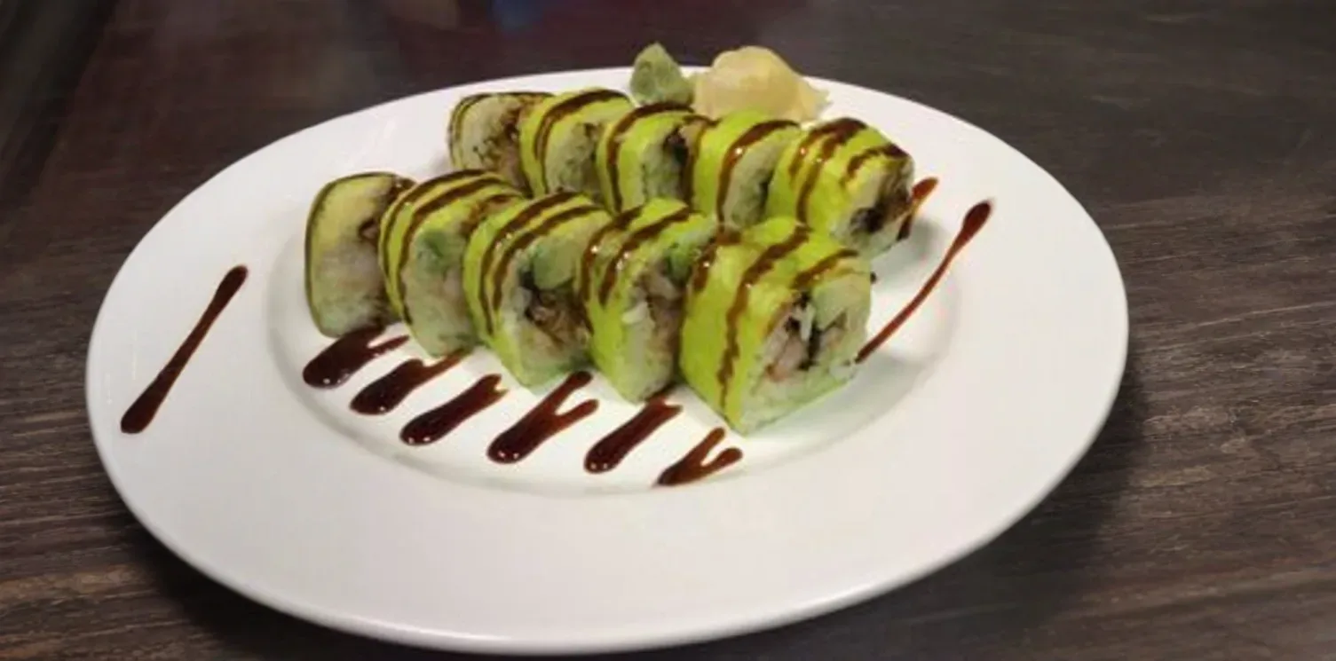A vibrant and intriguing signature sushi roll, featuring ten pieces. The 'Green Devil' roll typically boasts a fresh and possibly spicy profile, often incorporating ingredients like avocado, cucumber, and a fiery sauce or jalapeño, surrounding a delicious core filling.