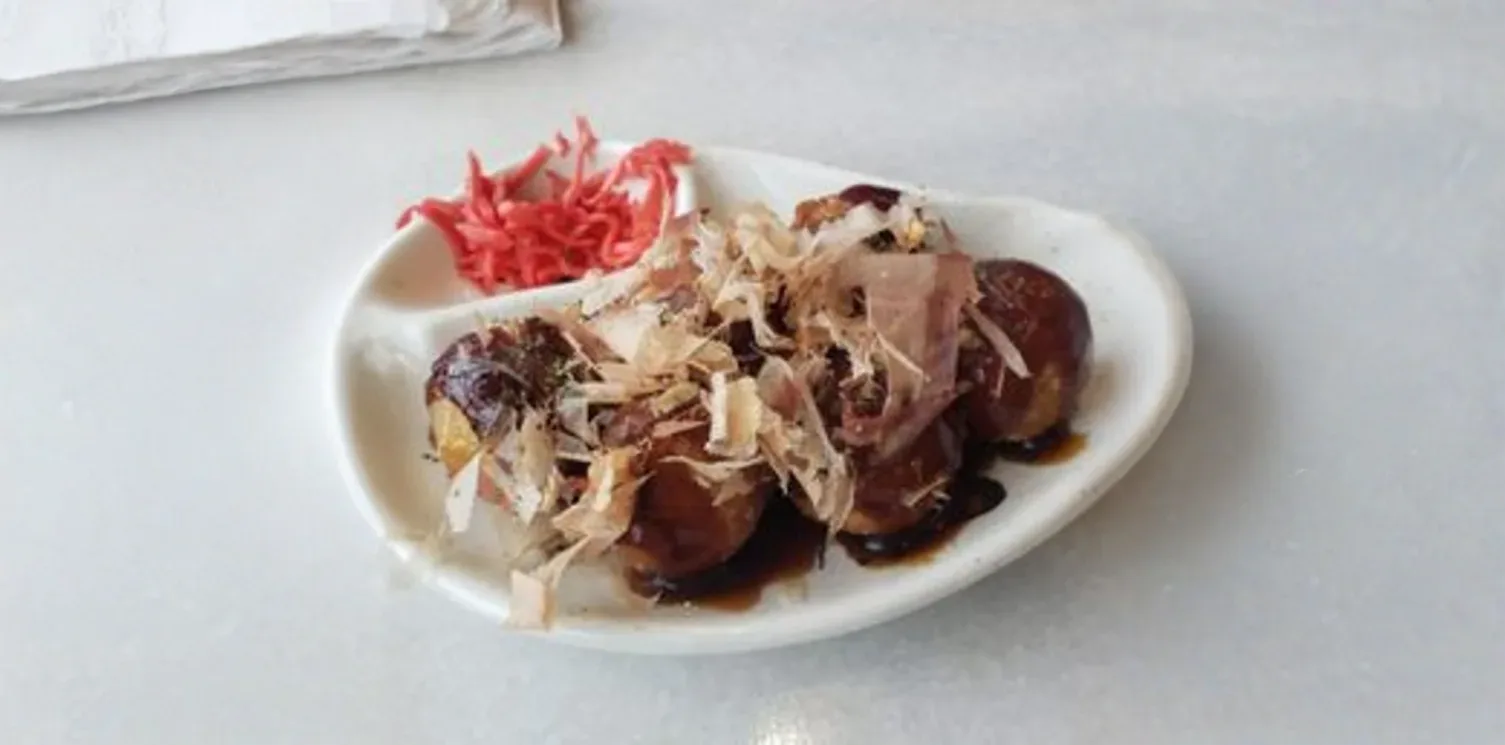 A popular Japanese street food, Takoyaki are savory, spherical wheat-flour dumplings filled with diced octopus (tako), tempura scraps (tenkasu), pickled ginger, and green onion. Cooked in a special molded pan, they are typically brushed with takoyaki sauce, drizzled with Japanese mayonnaise, and topped with katsuobushi (bonito flakes) and aonori (dried green seaweed).