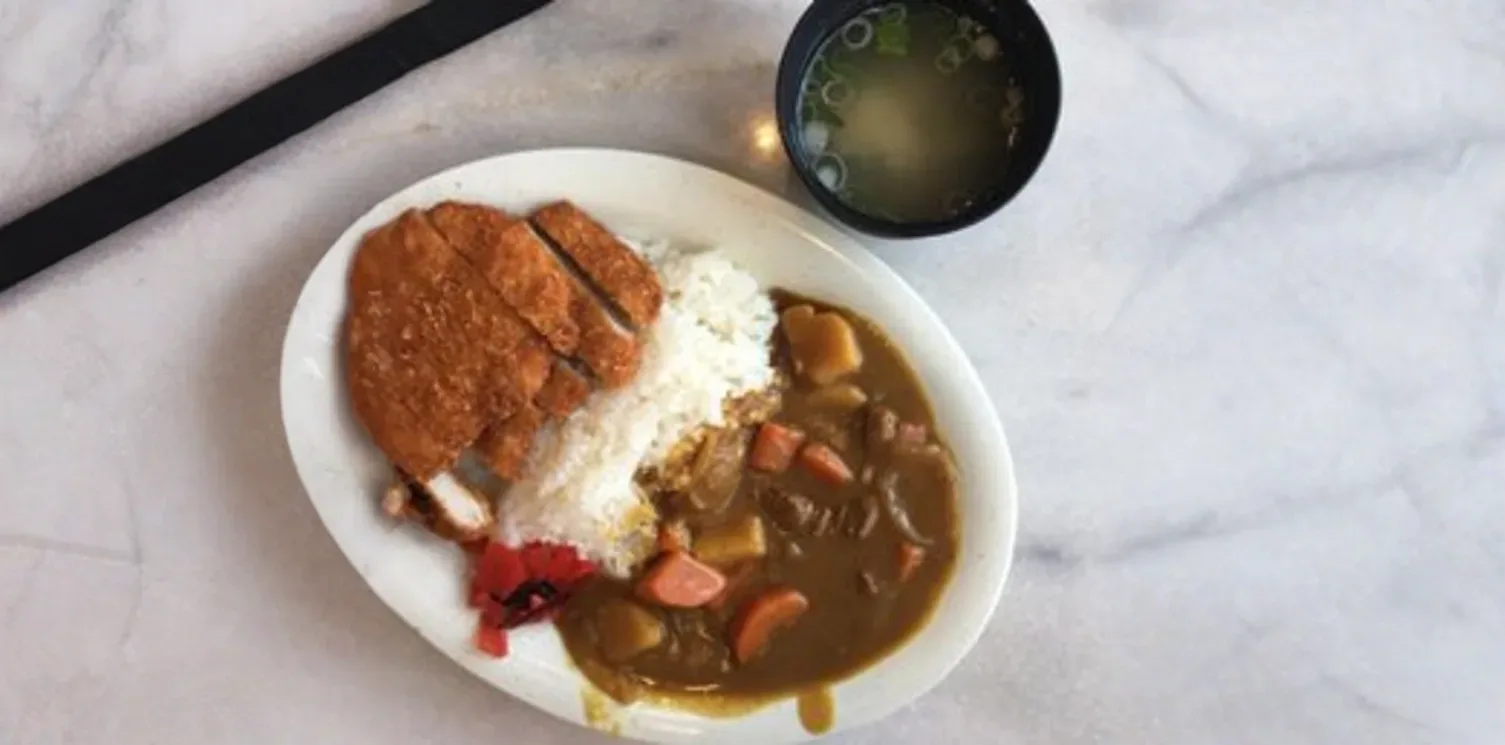 A beloved Japanese comfort food featuring a crispy, golden-brown pork cutlet (tonkatsu), breaded and deep-fried to perfection. It is served atop a bed of fluffy steamed rice, generously smothered in a rich, savory, and slightly sweet Japanese curry sauce. Often accompanied by pickled ginger or fukujinzuke.