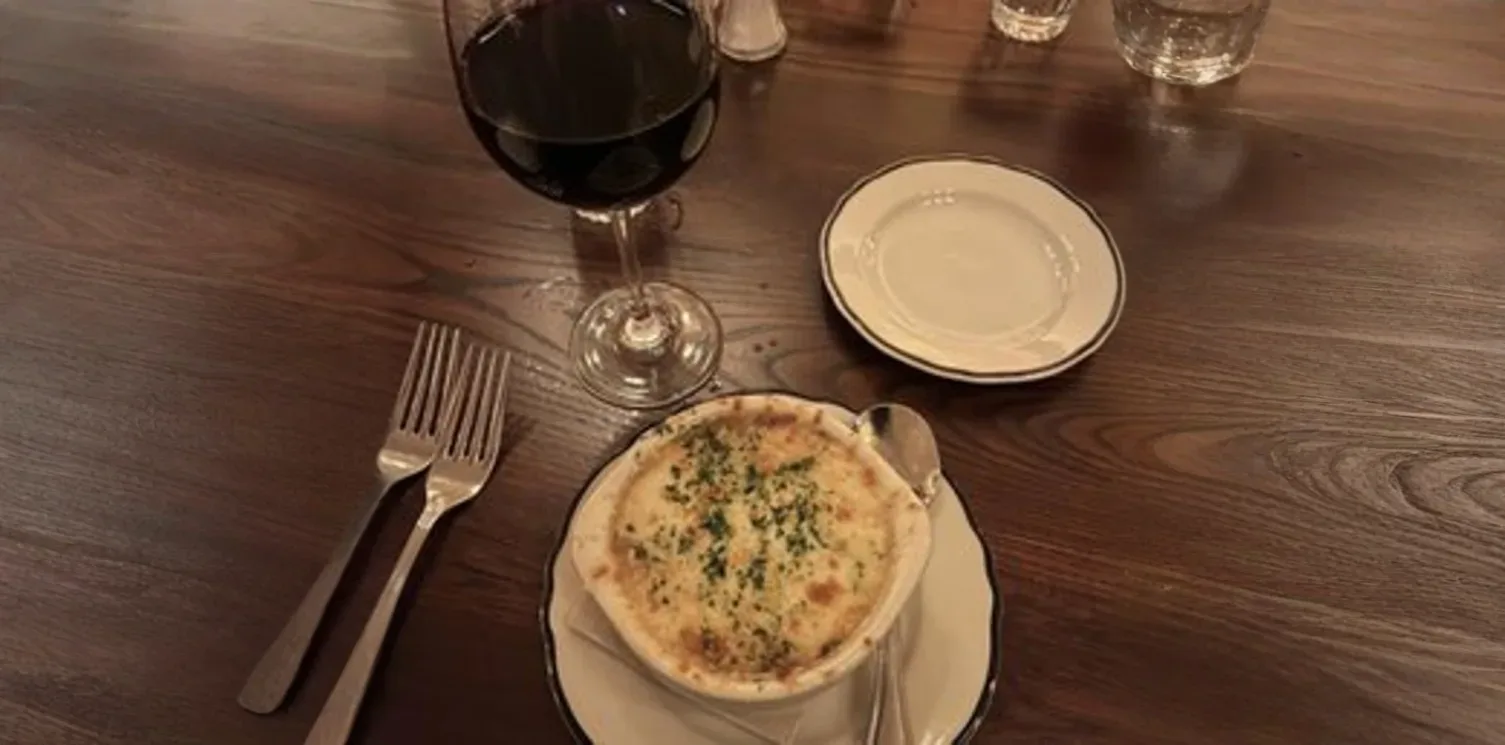 A heartwarming bowl of caramelized sweet onions simmered in a savory beef broth, topped with a toasted baguette slice and generously blanketed with a bubbling layer of melted Gruyère cheese.
