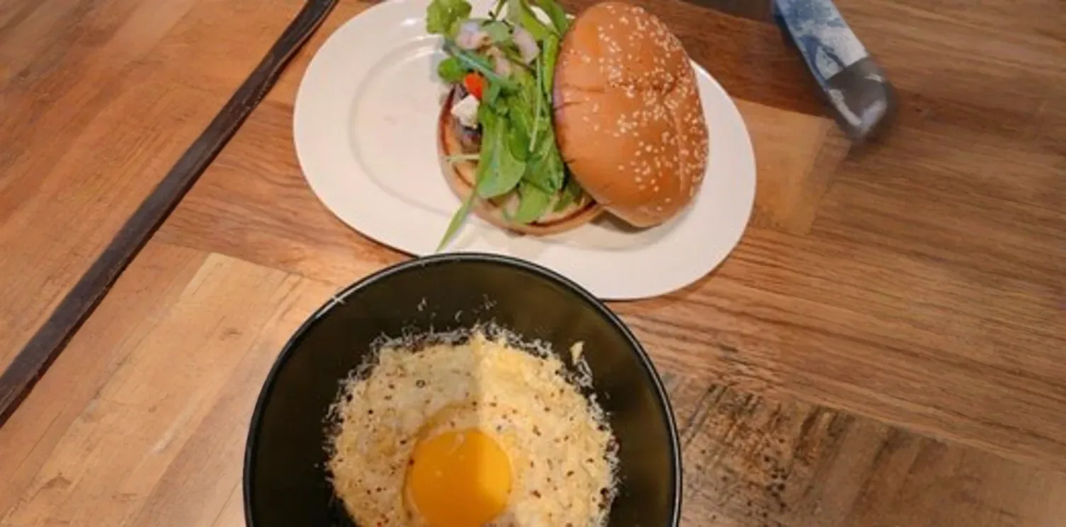 Our elevated Lamb Burger features a perfectly seasoned patty of ground lamb, topped with crumbled feta cheese, caramelized red onions, fresh arugula, and a roasted garlic aioli, all served on a toasted brioche bun.