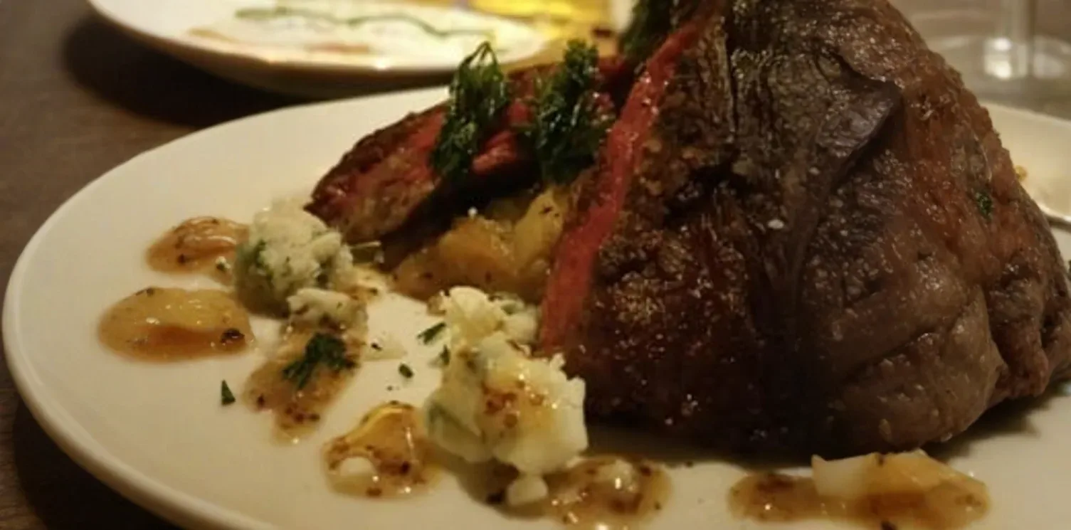 An exquisite cut of prime rib cap, known for its exceptional tenderness and rich, intense beef flavor. Expertly seared and roasted to perfection, accompanied by roasted heirloom carrots and a luxurious red wine reduction.