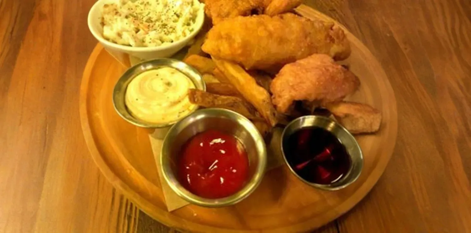 Crisp, golden-battered fresh white fish, typically cod or haddock, fried to perfection, ensuring a flaky and tender interior. Served alongside perfectly seasoned, thick-cut golden fries and a side of creamy house-made tartar sauce, embodying a beloved British pub classic.