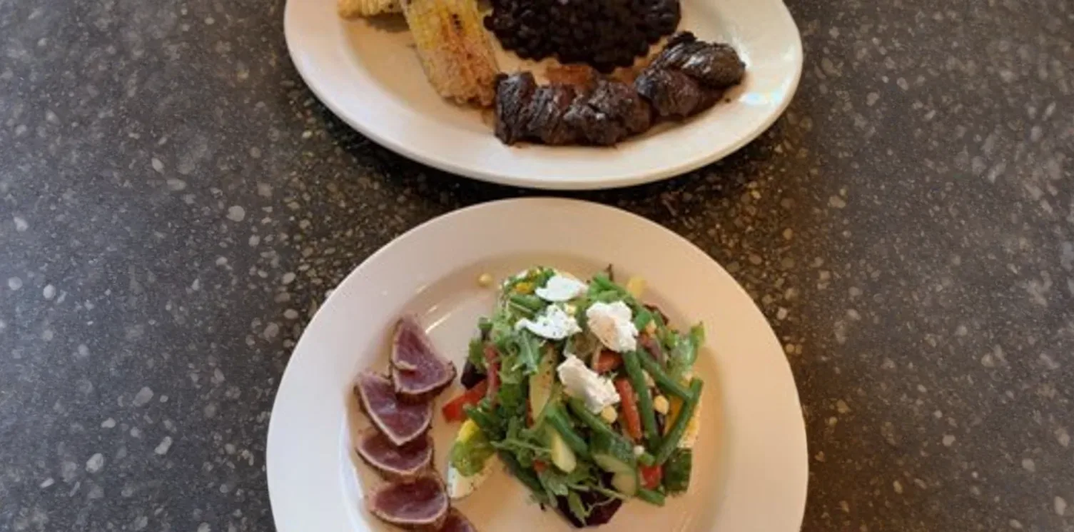 A vibrant and refreshing salad featuring perfectly seared, sushi-grade tuna, thinly sliced and served atop a crisp medley of mixed greens, fresh vegetables, and a light, zesty vinaigrette, offering a delightful balance of flavors and textures.