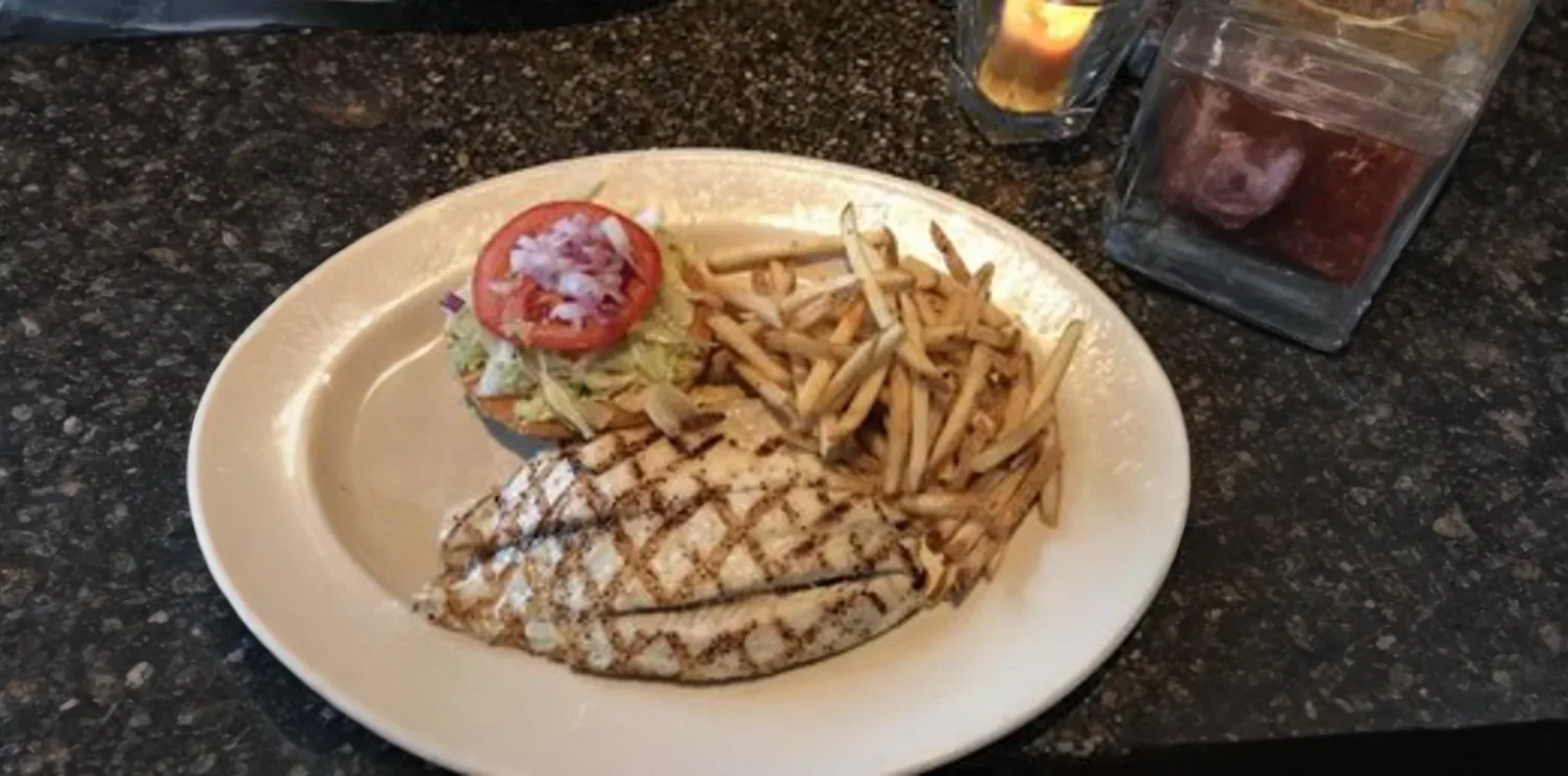 Our signature fish sandwich features a generous fillet of sustainable white fish, lightly crusted and fried to golden perfection. It's served on a toasted brioche bun with crisp butter lettuce, ripe tomato, and a tangy house-made remoulade sauce, creating a perfect balance of textures and flavors.