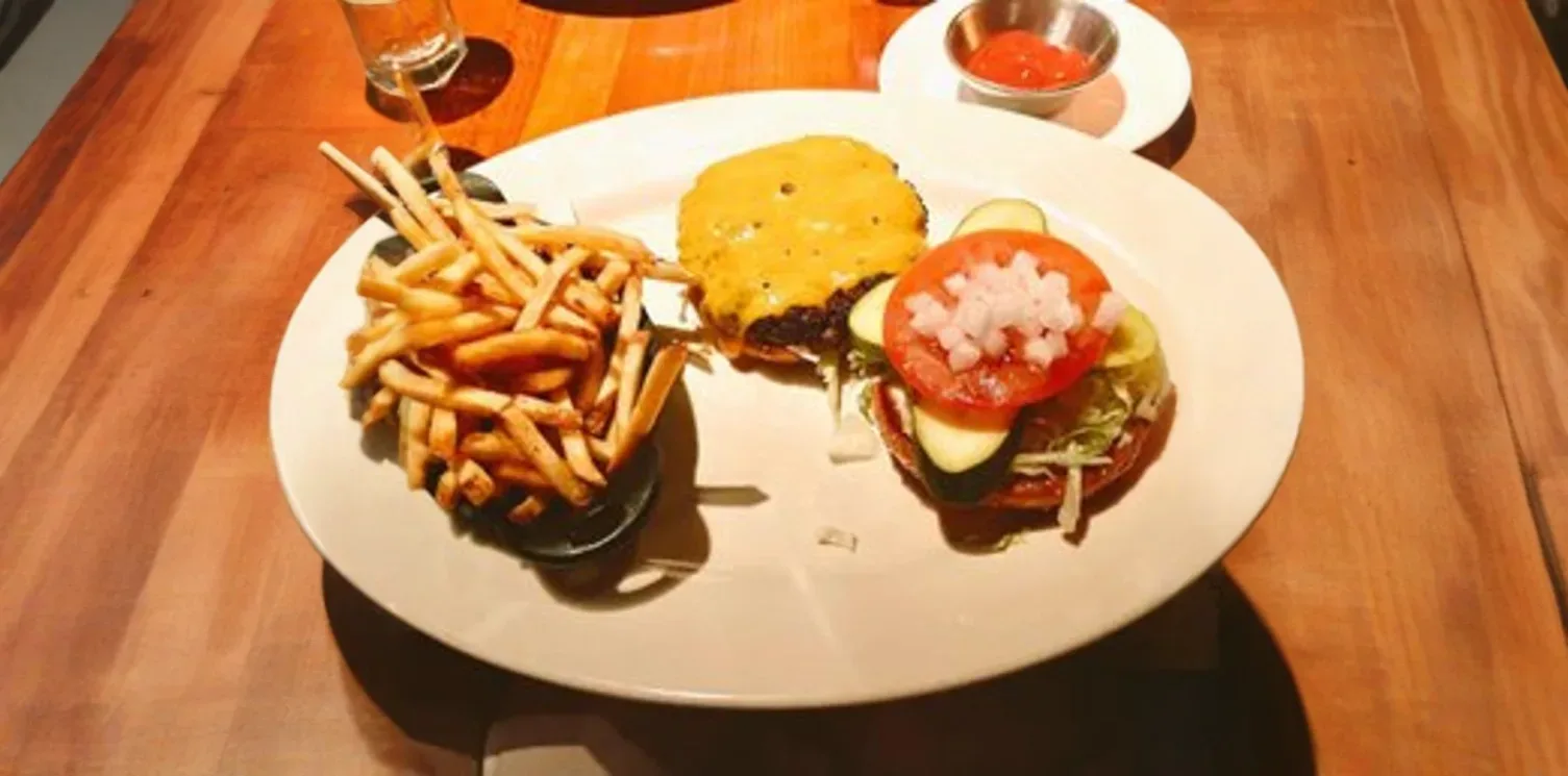 Our signature burger, crafted with a juicy, premium beef patty grilled to your liking. It's adorned with melted aged cheddar, crisp lettuce, ripe tomato, red onion, pickles, and our special house sauce, all served on a toasted brioche bun with a side of golden fries.