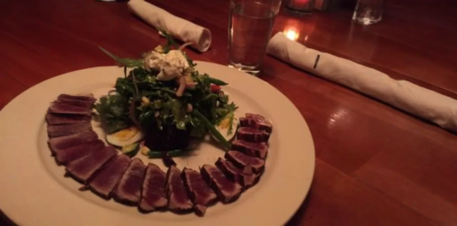 A prime cut of fresh Ahi tuna, expertly seared rare to lock in its delicate flavor and tender texture. This exquisite dish is typically accompanied by a vibrant vegetable medley and a light, complementary sauce to enhance its natural richness.