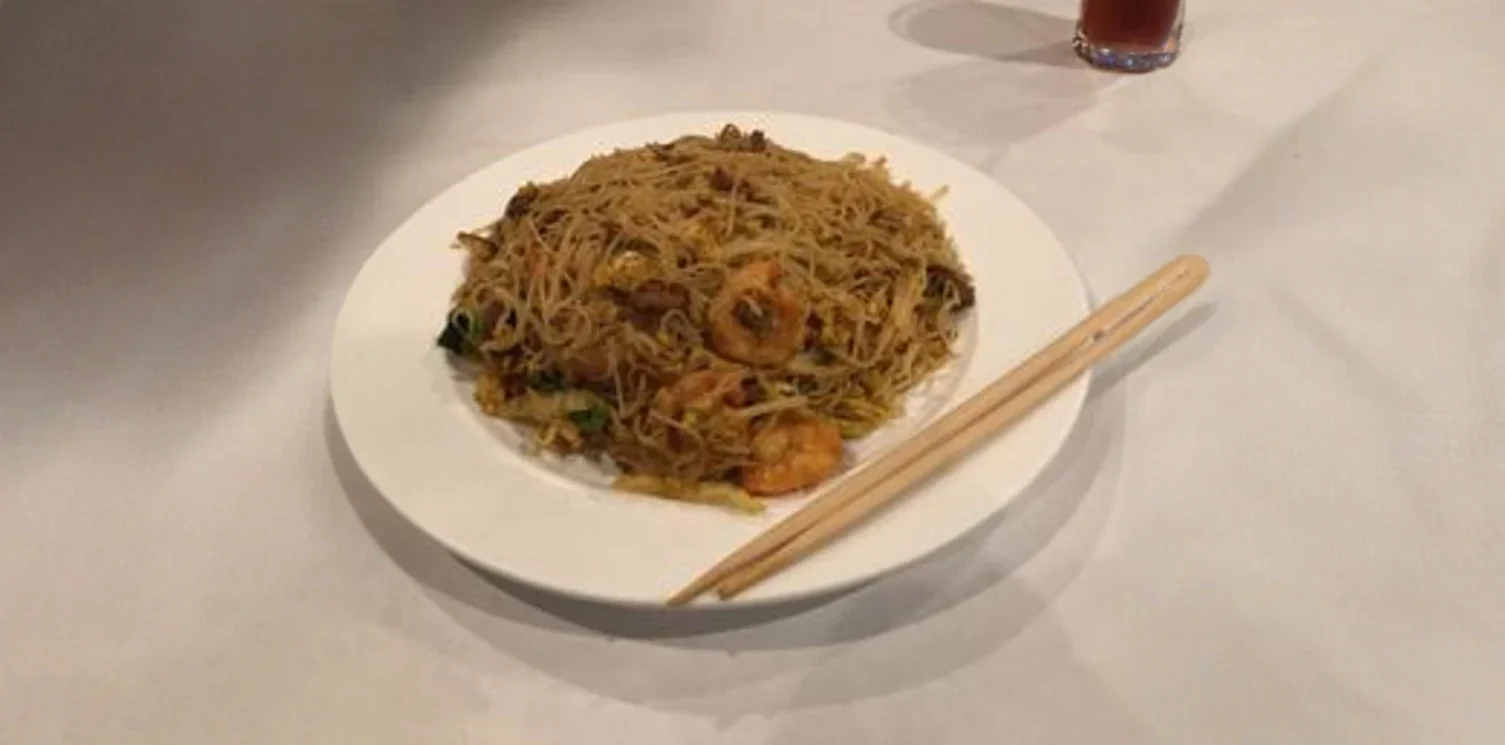 A classic and aromatic stir-fried dish featuring thin rice vermicelli noodles. Infused with a vibrant yellow curry powder, this flavorful noodle dish typically includes a medley of succulent chicken, tender shrimp, and savory BBQ pork, alongside crisp vegetables such as bell peppers, onions, and bean sprouts, often scrambled with egg. This satisfying and fragrant offering delivers a perfect balance of textures and a delightful, mildly spicy kick.
