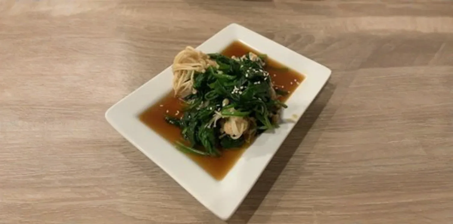 A vibrant and wholesome vegetarian dish featuring tender spinach leaves and earthy slices of fresh mushrooms, expertly stir-fried together. Lightly seasoned with garlic and a delicate sauce, this dish offers a delightful balance of flavors and textures, perfect as a side or a lighter main course.